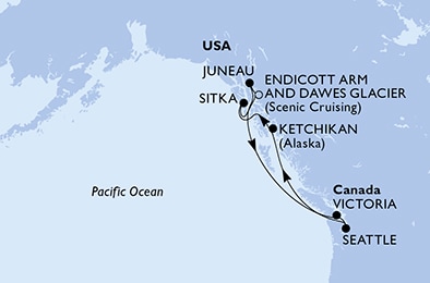 Маршрут круиза: Сиэтл - море - Кетчикан - Ситка - Эндикотт Арм фьорд - Джуно - море - Виктория - Сиэтл