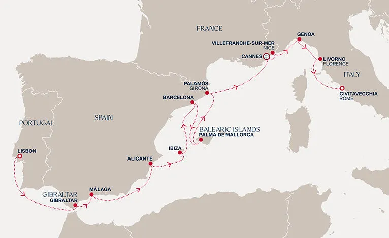 Маршрут круиза: Лиссабон - Лиссабон - Гибралтар - Малага - море - Аликанте - о. Ибица - Барселона - Пальма-де-Майорка - Паламос - Фекан - Фекан - Вильфранш / Ницца - Генуя / Милан - Ливорно / Флоренция, Пиза - Чивитавеккья / Ри
