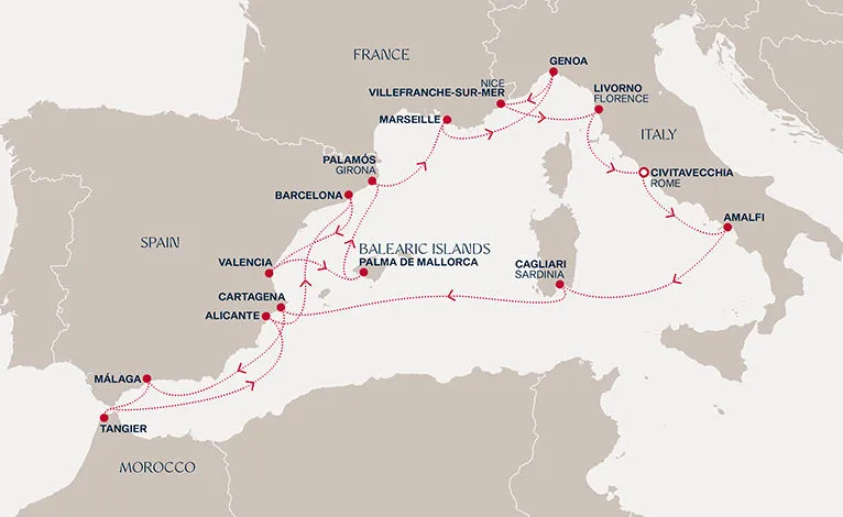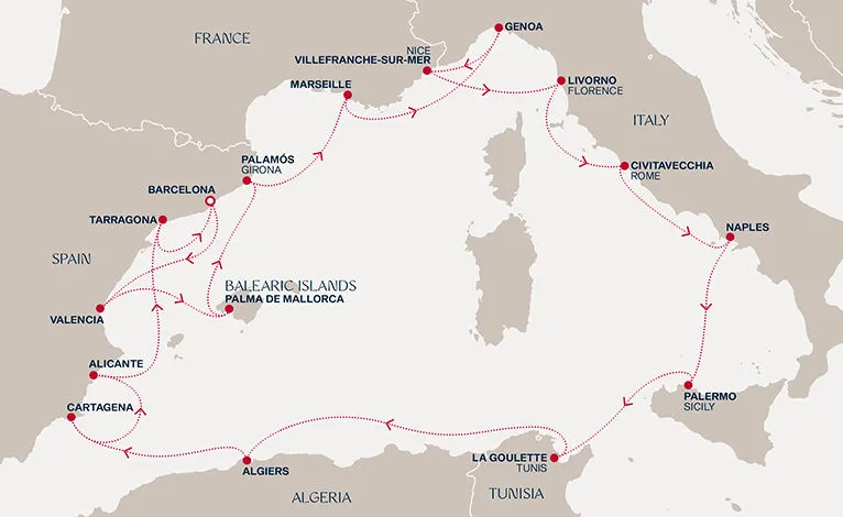 Маршрут круиза: Барселона - Валенсия - Пальма-де-Майорка - Паламос - море - Марсель - Генуя / Милан - Вильфранш / Ницца - Ливорно / Флоренция, Пиза - Чивитавеккья / Рим - Неаполь / Помпеи - Палермо, о. Сицилия - Ла-Гулетт - море - Алжир - Картахена - Аликанте - Таррагона - Барселон